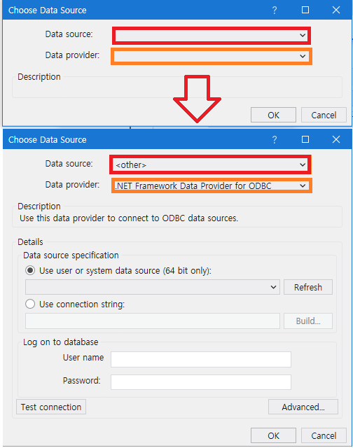 3.Data Source -> <other> 선택 Data provider ->. Net Framework Data Provider for ODBC 선택