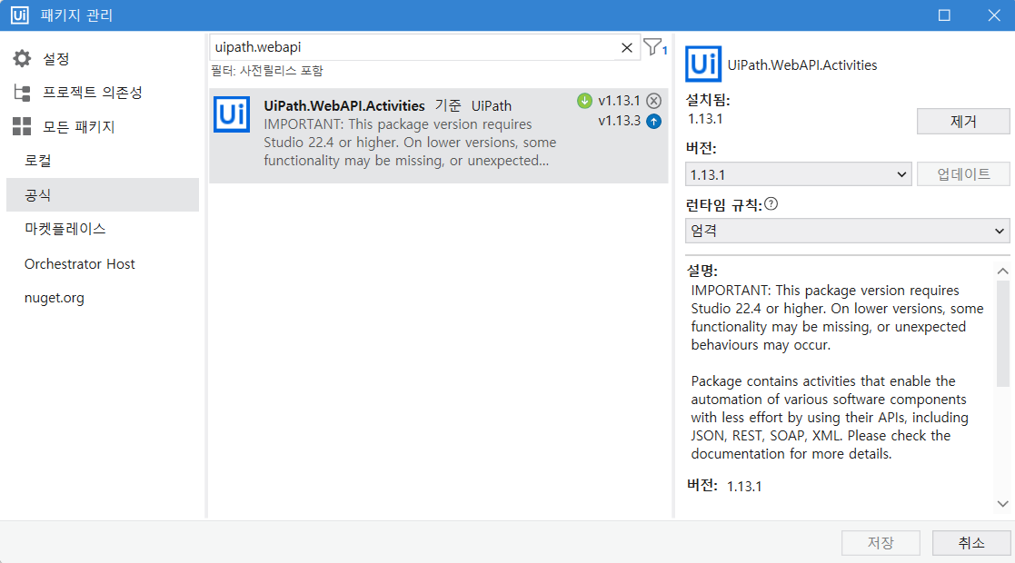 5-1. 패키지 관리 접속 -> 공식 -> 검색창에 Uipath.WebAPI 입력 후 설치 후 저장