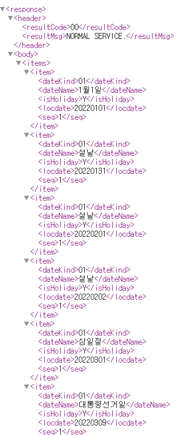위에 해당 값이 정상적으로 잘 됐는지 확인하는 방법은 URL 입력창에 End Point 값/getRestDeInfo? serviceKey=일반 인증키(Encoding) 값 입력&solYear=2022&numOfRows=100 그대로 입력하시면 아래와 같이 나옵니다