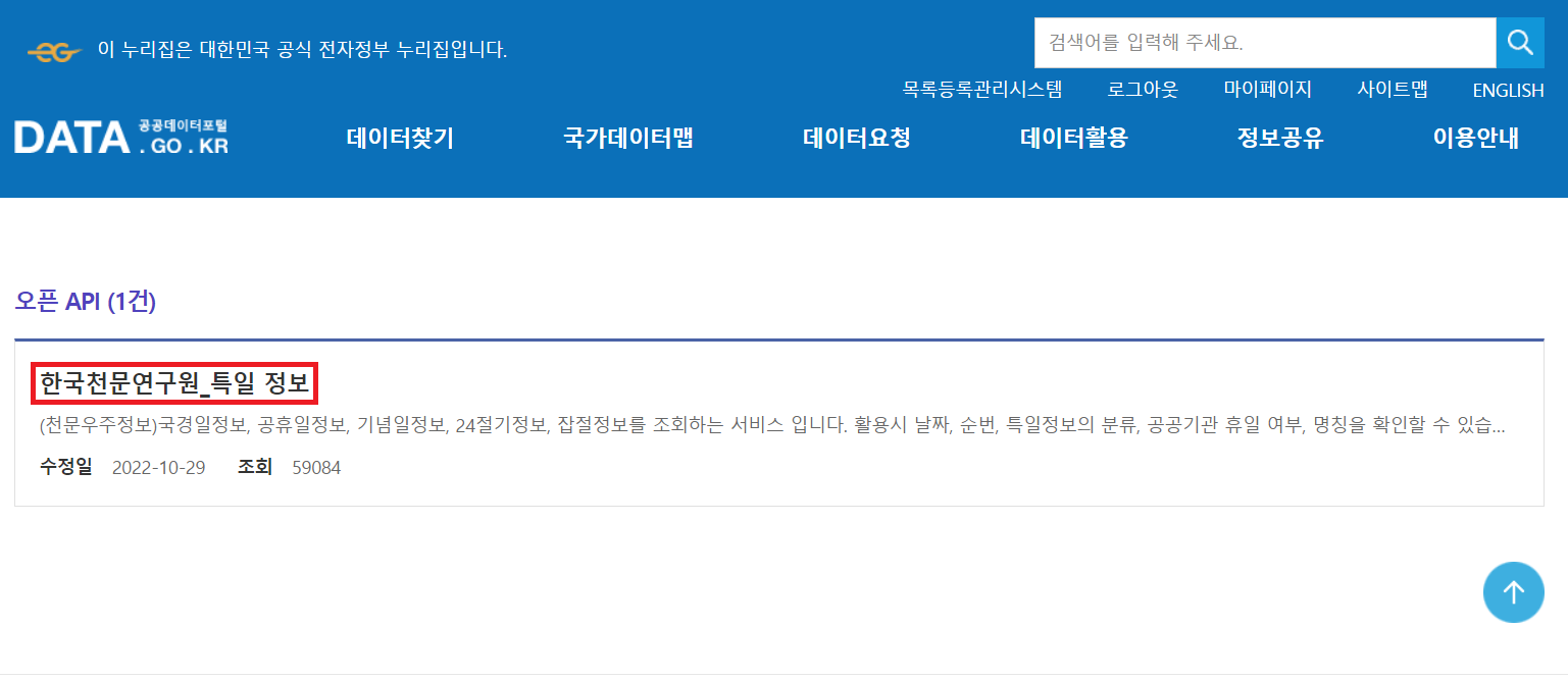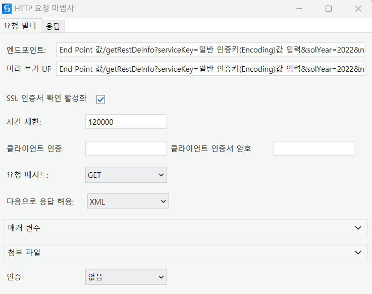 엔드포인트 값 : End Point 값/getRestDeInfo? serviceKey=일반 인증키(Encoding) 값 입력&solYear=2022&numOfRows=100