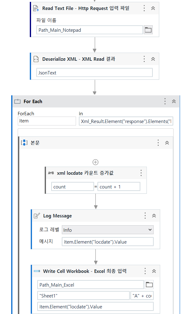 이때 For each에 속성 TypeArgument값은 System.Xml.Linq.XElement 선택 For Each에 in 값Xml_Result.Element("response"). Elements("body"). Elements("items"). Elements("item") 입력하면 됩니다.