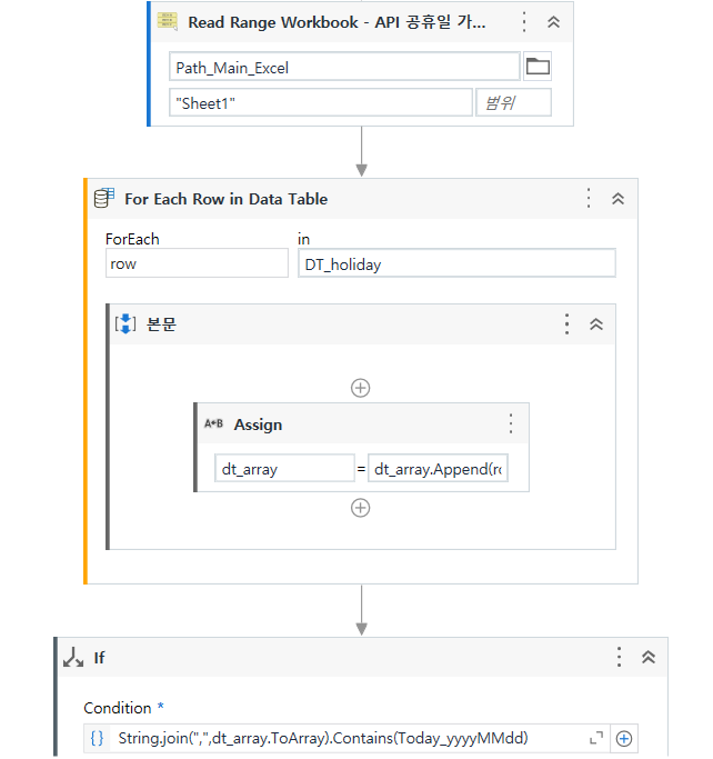 IF문을 통해 String.join(", ", dt_array.ToArray). Contains(Today_yyyyMMdd) 입력 여기서 복사 붙여 넣기 한다고 그대로 가져가시면 Contains안에 (Today_yyyyMMdd) 부분 에러 나니까 여기는 now.toString("yyyyMMdd")로 금일 날짜를 작성해주시면 됩니다.