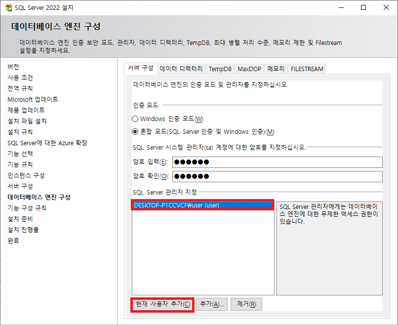 암호 입력 시 다른 곳에 적어두기 또는 절대 까먹지 않기 시스템 관리자인 SA계정에 대한 패스워드