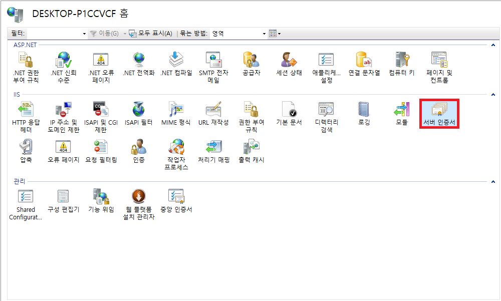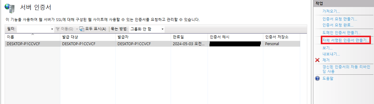 10. SSL 인증서 내용이 비어있을 텐데 시작버튼을 누르고 IIS(인터넷 정보 서비스)관리자 클릭 - 서버 인증서 -자체 서명된 인증서 만들기 - 인증서 이름 작성 후 인증소 저장소 선택을 개인으로 선택 후 확인