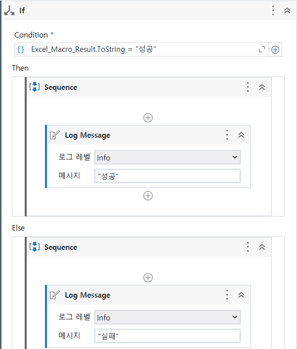 Excel_Range_PNG_Result의 결과 값으로 IF문을 통해 성공, 실패 여부를 확인하여 로직을 진행한다 실패일 경우 Throw를 사용하여 확인을 한다 성공일 때는 정상 로직 실행을 하면 된다
