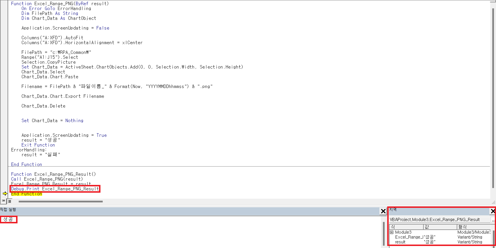 F8을 눌러 하나씩 실행하면서 지역 창에는 변수가 설정된 값이 어떻게 들어왔는지 확인이 가능하고 직접 실행창에는 Debug.Print를 통해 어느 위치에 값이 잘못 가져왔는지 또는 어디까지 성공하고 어디부터 에러인지 확인하기 위해 사용