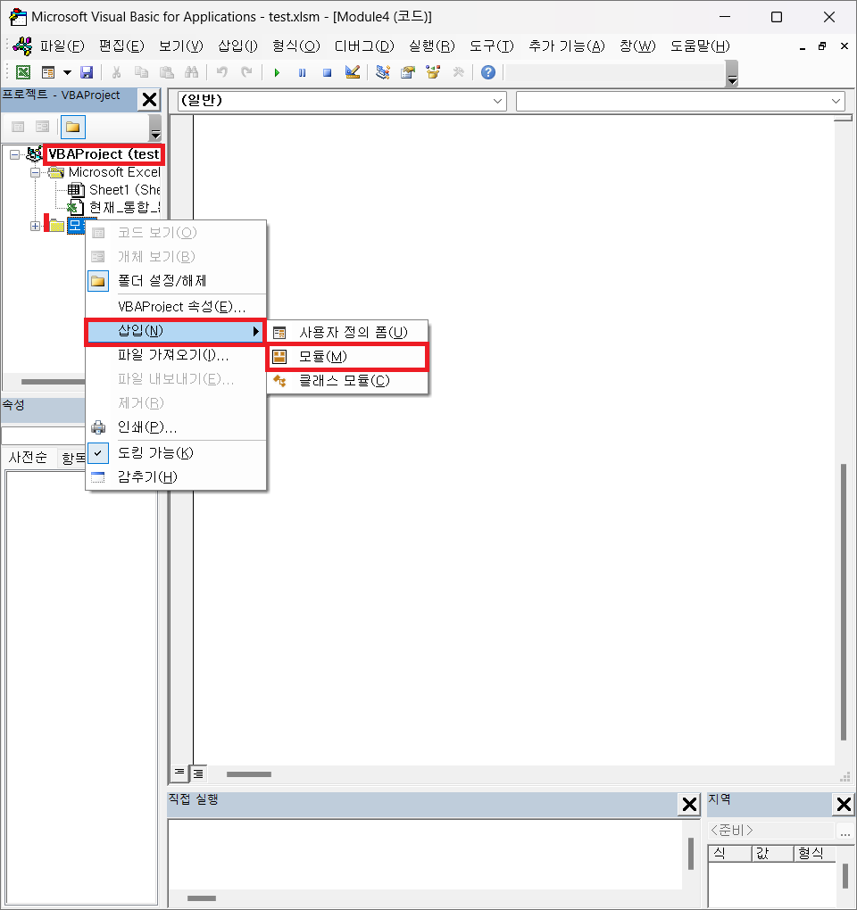왼쪽 상단에 VBAPorject 우클릭 -> 삽입 -> 모듈 선택을 한다