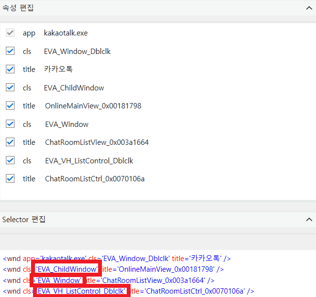 아래 소스 중 카카오톡 관련 컨트롤하는 부분의 값? Uipath를 통해 값을 얻을 수 있습니다 만약 FindWindow에 대한 값이 변경된다면 Uipath로 확인하시면 됩니다