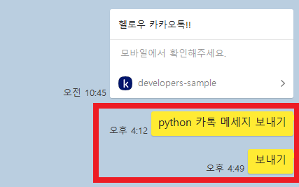위 코드를 실행하면 빨간색 영역 부분이 발송된 부분이며 위에 헬로 카카오톡!! 은 저번 api 메시지 보내기 테스트 결과 내용이다